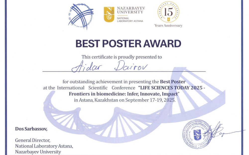 As part of the conference, competitions for young scientists were held. The Best Poster Award was presented to Aidar Kuanishbekovich Dairov, a research fellow at the Stem Cell Laboratory of the National Center for Biotechnology and a PhD student at the Department of General Biology and Genomics, L.N. Gumilyov Eurasian National University.